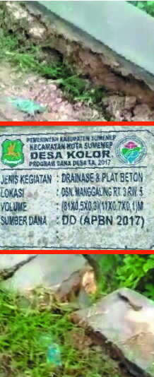 Hal itu adanya data yang telah digali oleh awak media ini pada beberapa waktu lalu menemukan dugaan penyimpangan dalam pengerjaan proyek draenase dan Plat Beton di Dusun Manggaling Desa Kolor, sehingga proyek baru di kerjakan di tahun 2017 ini, terlihat jelas sudah banyak yang rusak pecah sampai terputus dan di bibir draenase lobang-lobang seperti goa.