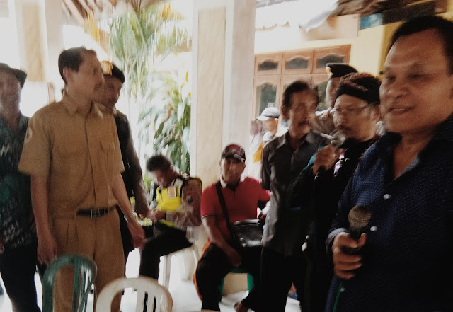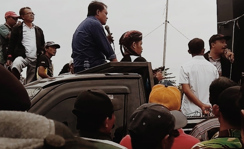 | Foto: H. Ibnu Gofor beserta Chosim, Kepala Desa Kwatu dengan Warga pada saat aksi demo berlangsung |