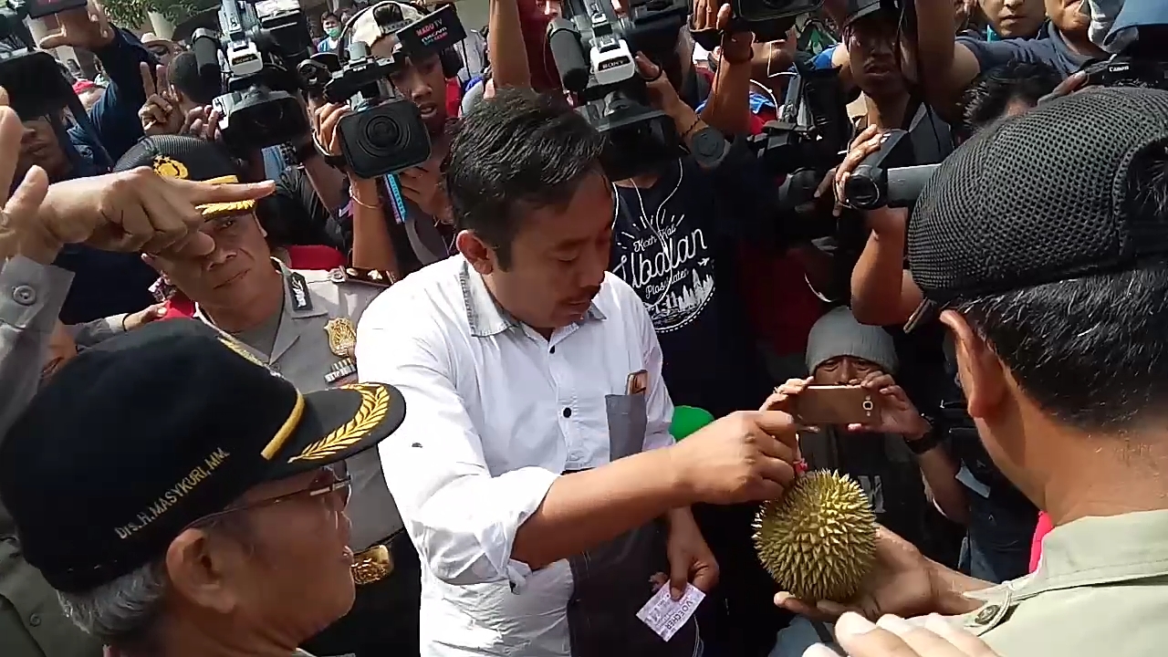 | Foto: Pihak Panitia dari Pemdes Medowo melakukan kerjasama untuk membagikan buah Durian kepada para pengunjung |