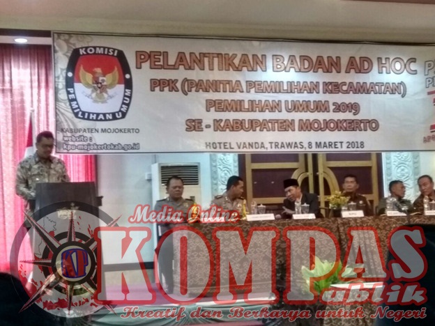 Mojokerto. kompaspublik.com- Sebanyak 54 orang anggota Panitia Pemilihan Kecamatan (PPK) dilantik oleh Komisi Pemilihan Umum (KPU) Kabupaten Mojokerto untuk Pemilihan Presiden (Pilpres) Tahun 2019. Sehingga dapat diketahui bahwa tiap-tiap Kecamatan se-Kabupaten Mojokerto terdapat tiga (3) orang PPK.