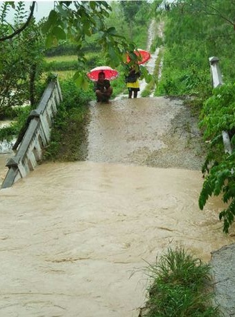 Sumenep. kompaspublik.com- Ambruknya jembatan penghubung Dusun Lenteng dengan Dusun Montorna Desa Montorna Kecamatan Pasongsongan Kabupaten Sumenep akibat penyangga atau tiang jembatan diterjang luapan air sungai dari hujan deras pada hari Minggu 11/03/2018.