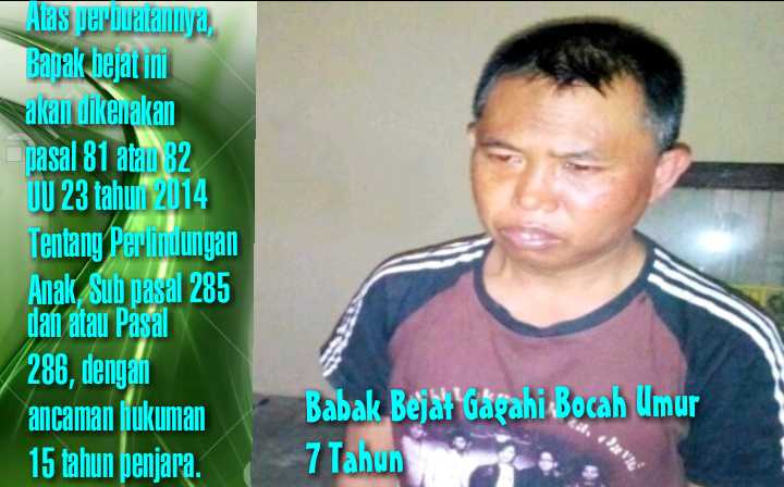 Atas perbuatannya, ayah bejat ini akan dikenakan pasal 81 atau 82, UU 23 tahun 2014 Tentang Perlindungan Anak, Sub. Pasal 285 dan atau Pasal 286, dengan ancaman hukuman 15 tahun penjara.