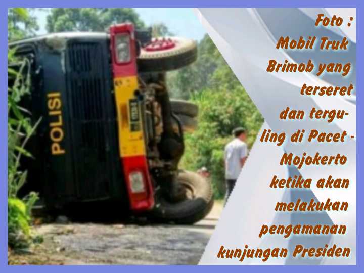 Media Online Kompas Publik– Kali ini Mobil truk Kepolisian bernopol 1756-X yang mengangkut anggota Brimob Polisi Daerah Jawa Timur (Polda Jatim) yang jadi rombongan pengamanan Presiden Republik Indonesia (RI), Joko Widodo terguling di Jalan Raya Menjeng, Desa Nogosari, Kecamatan Pacet, Kabupaten Mojokerto, Jawa Timur.