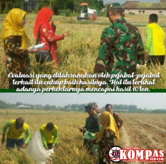 Media Online Kompas Publik- Dalam membantu upaya khusus peningkatan dan pengamatan produktifitas hasil Padi para petani oleh Pelda Dodik Armanto, Babinsa Koramil 0816/15 Sukodono bersama instansi terkait dari POPT, BPK, PPL dan Poktan Sami Rukun I pada hari Selasa (9-10-2018) pukul 08.00 dilokasi persawahan Kelompok Tani (Poktan) Sami Rukun I Ds. Pademonegoro Kec. Sukodono yang dihadiri Dinas pertanian Kabupaten Sidoarjo, ibu Ilmi melaksanakan ubinan untuk mengetahui berapa hasil produktifitas hasil perolehan panen padi yang diperoleh dalam perhetarnya. Selanjutnya kegiatan ini sebagai tindakan dalam pengamatan dan pengawasan oleh para petugas pertanian dilapangan sejauh mana hasil tanaman padi yang dikelola oleh para petani binaannya, apakah sudah sesuai standard apa belum. Sedangkan didalam kegiatan itu, Petugas POPT, HM. Jainul Imron. BPK, H Chusaini, SP. Dan PPL, Navy D. SP. dan Poktan Sami Rukun, Bpk Sartono. Kades Pademonegoro juga andil dalam mengevaluasi hasil ubinan yang telah dilaksanakan bahwa hasil yang didapat dalam petak ubinan tersebut.