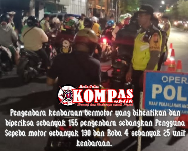 “Pengendara kendaraan bermotor yang dihentikan dan diperiksa sebanyak 155 pengendara sedangkan Pengguna Sepeda motor sebanyak 130 dan Roda 4 sebanyak 25 unit kendaraan. Untuk pengendara yang ditilang 21orang pelanggar lalu lintas dan barang bukti yang disita STNK sebanyak16 lembar dan SIM 2 lembar. BB 3 Roda 2 tanpa dilengkapi dengan surat-surat kendaraan,” ujar Kompol Dwi Eko Budi Sulistiyono..