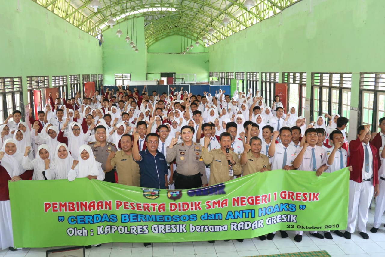 Kapolres mengatakan, saat ini pemerintah tengah gencar memerangi berita hoax, bahkan Kepolisian juga sudah menangkap kelompok yang sengaja menyebarkan hoax, isu sara dan ujaran kebencian. Kapolres mengimbau kepada seluruh pelajar SMAN 1 Gresik sebagai pengguna media sosial saat ini perlu lebih berhati hati dalam menyebarkan informasi yang diterima, Senin (22/10/2018).