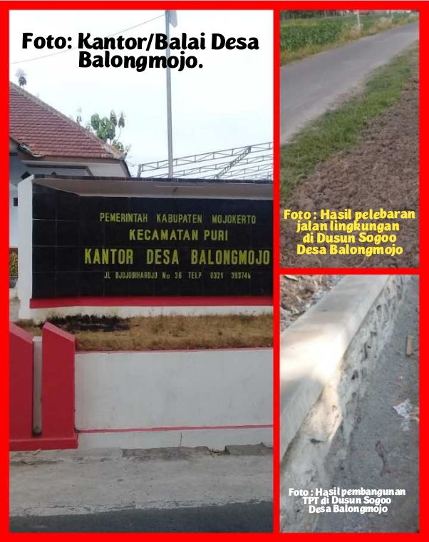 Dan saat awak media ini menghadap H. Catur Muji Santoso (Kades Balongmojo. Red) yang terkenal dengan keramahannya ini menerangkan, jika untuk tahun ini (2018), pihaknya telah membangun Tembok Penahan Tanah (TPT) beserta 2 titik pelebaran jalan lingkungan di Dusun Sogoo, Jembatan baru di Dusun Setoyo, Draenase di Dusun Jetak dan Karangnongko dengan dibiayai Dana Desa (DD) tahap 1 dan 2.