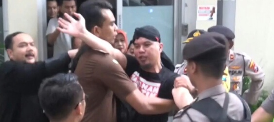 Saat mendekati para jurnalis yang menunggunya, Dhani yang mengenakan kaus hitam bertuliskan ‘tahanan politik’ itu ditahan oleh petugas kejaksaan dan sejumlah personel kepolisian. Aksi tarik dan saling teriak pun terjadi.