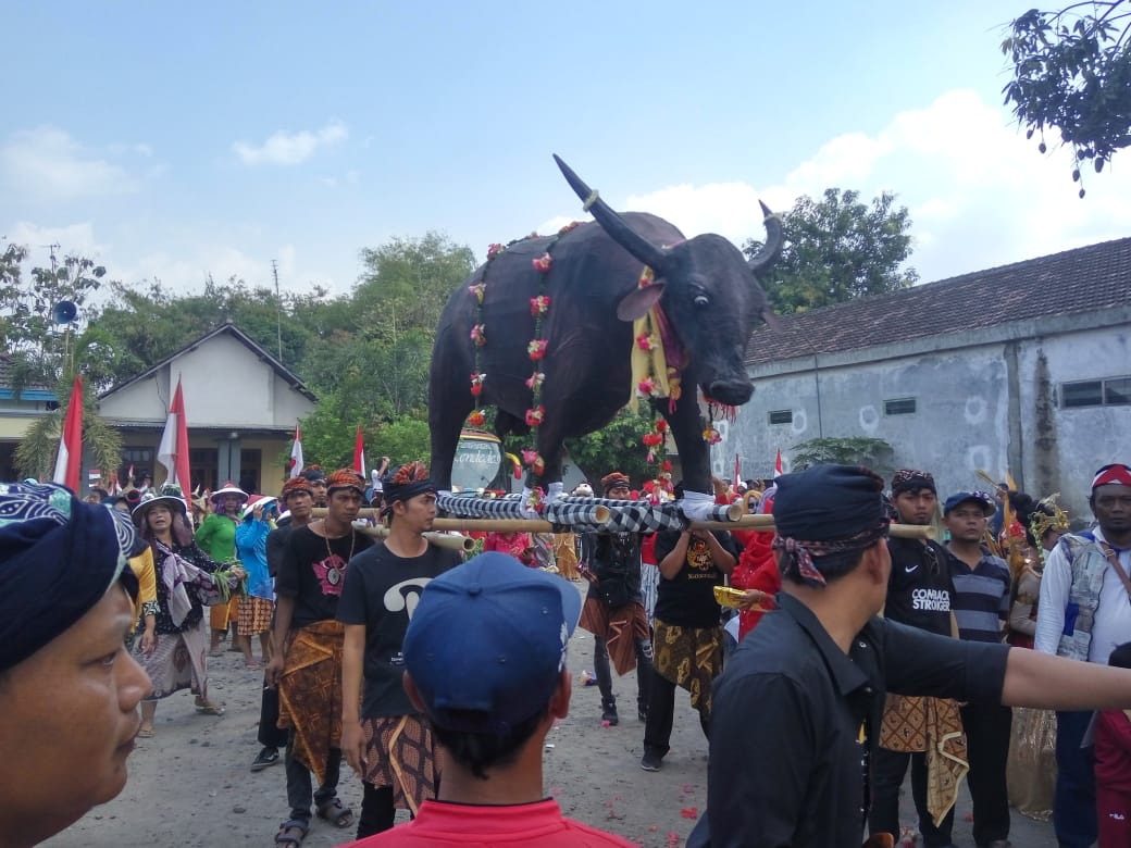 Sementara Kontingen RT. 16 yang dipimpin Cak R.Khan tak kalah menarik menampilkan ritual unik dan mendebarkan. Ritual yang diberi nama Kebo Edan itu dimulai dengan pembakaran dupa dan kemenyan yang dibawa mengelilingi merah putih jumbo diikuti anggota yang masing-masing menampilkan ragam profesi mata pencaharian penduduk. Sang Kebo sendiri, menurut seniman Ngares itu melambangkan kemakmuran juga turu diangkat mengitari merah putih. Pelukis produktif itu menjelaskan, seluruh ritual untuk menunjukkan semua kompak menjaga kesetiaan pada NKRI.