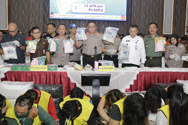 Kapolrestabes Surabaya, Kombes Pol Sandi Nugroho, mengatakan, hasil ungkap sabu itu memang hasil pengembangan ungkap yang dilakukan Direktorat Reserse Narkoba Polda Jatim. Selain narkoba jenis sabu, diamankan pula 14.263 butir ekstasi dan 3,8 juta pil koplo.