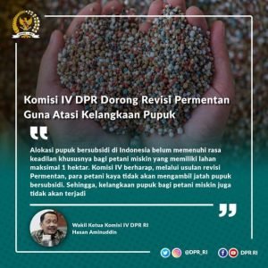 “Alokasi pupuk bersubsidi di Indonesia belum memenuhi rasa keadilan khususnya bagi petani miskin yang memiliki lahan maksimal 1 hektar. Komisi IV berharap, melalui usulan revisi Permentan ini, para petani kaya tidak akan mengambil jatah pupuk bersubsidi. Sehingga, kelangkaan pupuk bagi petani miskin juga tidak akan terjadi,” ujar Hasan.