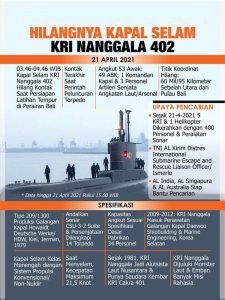 Panglima Tentara Nasional Indonesia (TNI) Marsekal Hadi Tjahjanto menyampaikan, Kapal Selam KRI Nanggala-402 dipastikan tenggelam dan 53 awak kapal telah gugur.