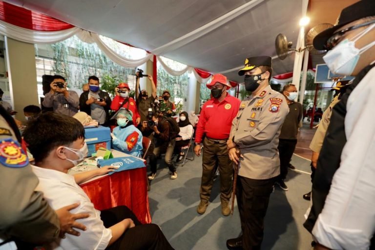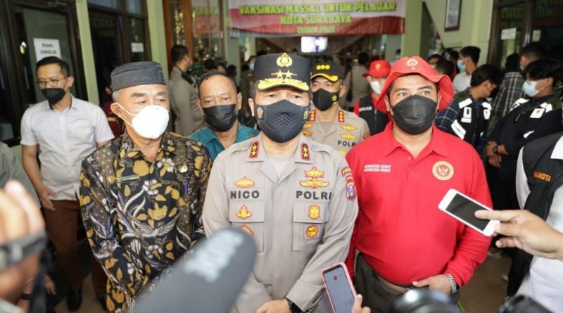 Kapolda Jatim, Irjen Pol Dr. Nico Afinta, S.I.K., S.H., M.H didampingi Pejabat Utama (PJU) Polda Jatim, kala itu melakukan pengecekan pelaksanaan Vaksinasi Merdeka untuk Dosis Tahap ke dua di SMP Negeri 1 Surabaya, Kamis 12 Agustus 2021.
