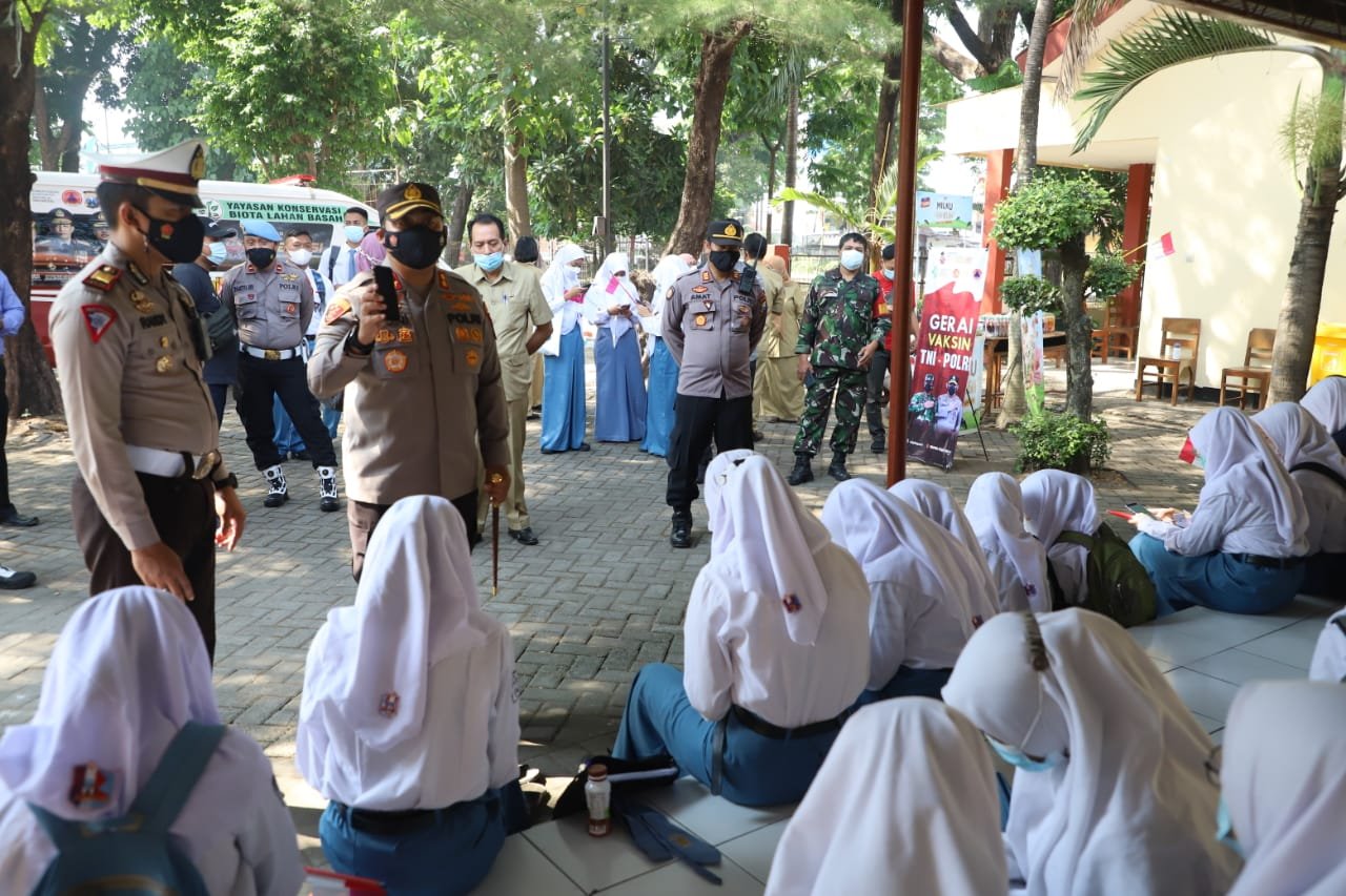 Mojokerto, Media Allround (kompaspublik.com)- Vaksinasi Putih Abu-abu kembali digelar oleh Polres Mojokerto di SMAN 1 Sooko di Kecamatan Sooko, Kabupaten Mojokerto. Sehingga dalam kesempatan ini, Kapolres Mojokerto AKBP Dony Alexander, S.I.K., M.H. juga mensosialisasikan aplikasi PeduliLindungi. Tapi kelihatannya, kegiatan kali ini sasarannya adalah ratusan pelajar Sekolah Menengah Atas (SMA), Selasa 24 Agustus 2021.