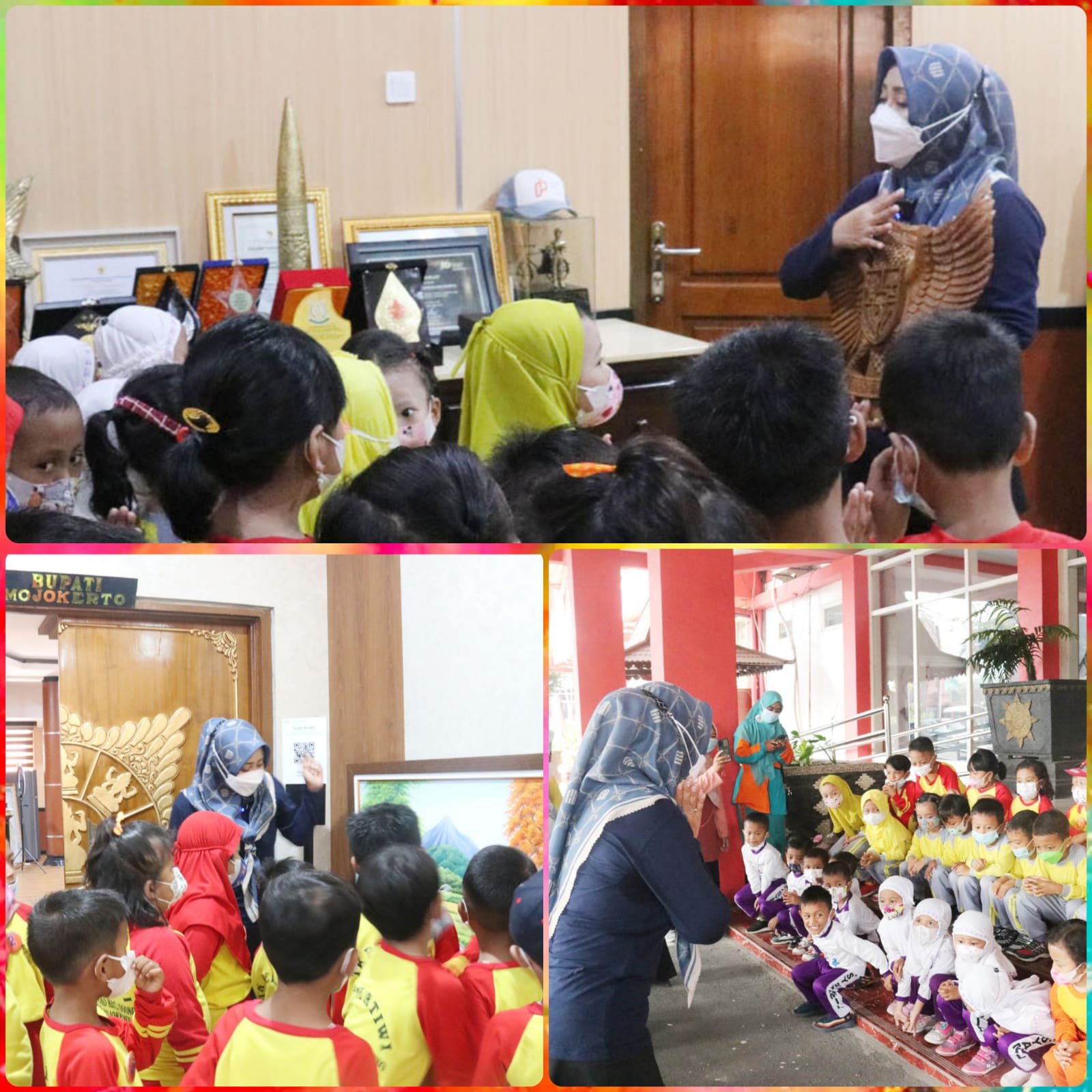 Usai bernyanyi bersama dengan siswa siswi TK dan KB di depan gedung Sekretariat Daerah Kabupaten Mojokerto, selanjutnya Ikfina mengajak para siswa untuk berjalan-jalan melihat ruang kerja Bupati Mojokerto yang berada di lantai dua Sekretariat Daerah Kabupaten Mojokerto.