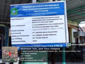 Sidoarjo, Media Allround – Rekanan proyek di Dinas PU Bina Marga kabupaten Sidoarjo yang melaksanakan pekerjaan drainase berlokasi di Dusun Singopadu RT 04 RW 02, Desa Singogalih, Kecamatan Tarik, Kabupaten Sidoarjo minim mendapat pengawasan dari pihak terkait yakni mengabaikan Keselamatan dan Kesehatan Kerja ( K3).