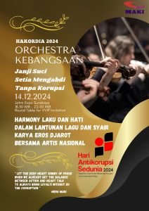 Surabaya, Media Allround – Lembaga Swadaya Masyarakat Masyarakat Anti Korupsi Indonesia (MAKI) Koordinator Wilayah Jawa Timur mempersembahkan Orchestra Kebangsaan bertajuk “Janji Suci Setia Mengabdi Tanpa Korupsi” tepat di peringatan Hari Anti Korupsi Sedunia (Hakordia) 2024.